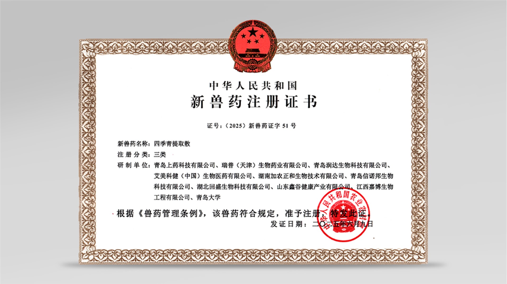 近日,农业农村部正式公布了新一批国家新兽药名单。海大集 团旗下“姜黄提取散”、“四季青提取散”及“猪流行性腹泻病毒 免疫荧光检测试纸条”三款动保产品成功获批,荣获国家新兽药。 这标志着海大在绿色动保产品研发与疫病精准诊断技术领域取得了 又一重要突破。