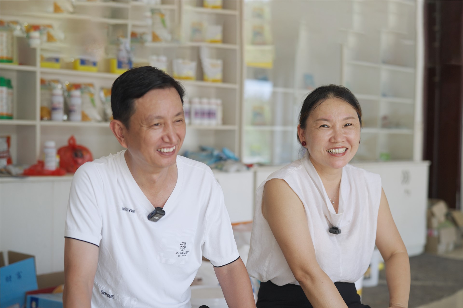 芳姐也是吃苦长大,打小帮家里做小商品生意,自有尝遍甘苦的觉知与智慧,在与伟哥做贩鱼生意时,也留意着更好路径。2006年他们做起饲料生意,但做了几个厂家产品后,认识到好产品的重要性;2010年朋友告诉他们海大饲料吨产高,两人考察发现海大是一家持续进步的公司,产品品质稳定且不断升级,于是果断选择海大。此后他们专销海大饲料,量越做越大,也明白这行不止是买卖,更是服务,只有养户赚钱,自己才能赚钱。于是,跟着海大团队跑塘口成为常事,打样、测水,甚至帮养户规划养殖,他们越来越专业。
